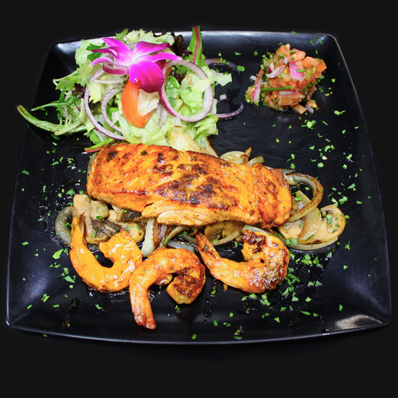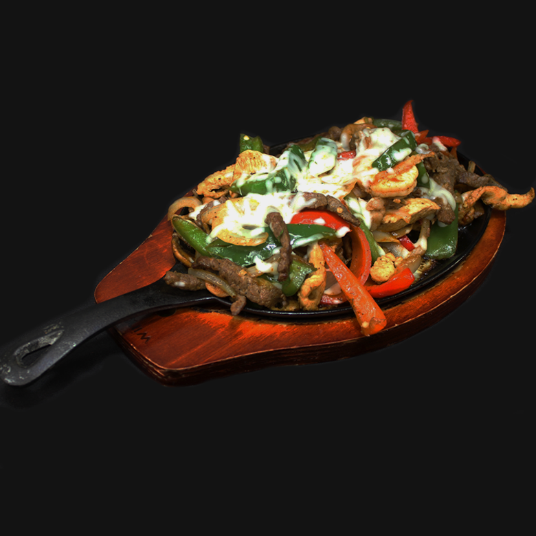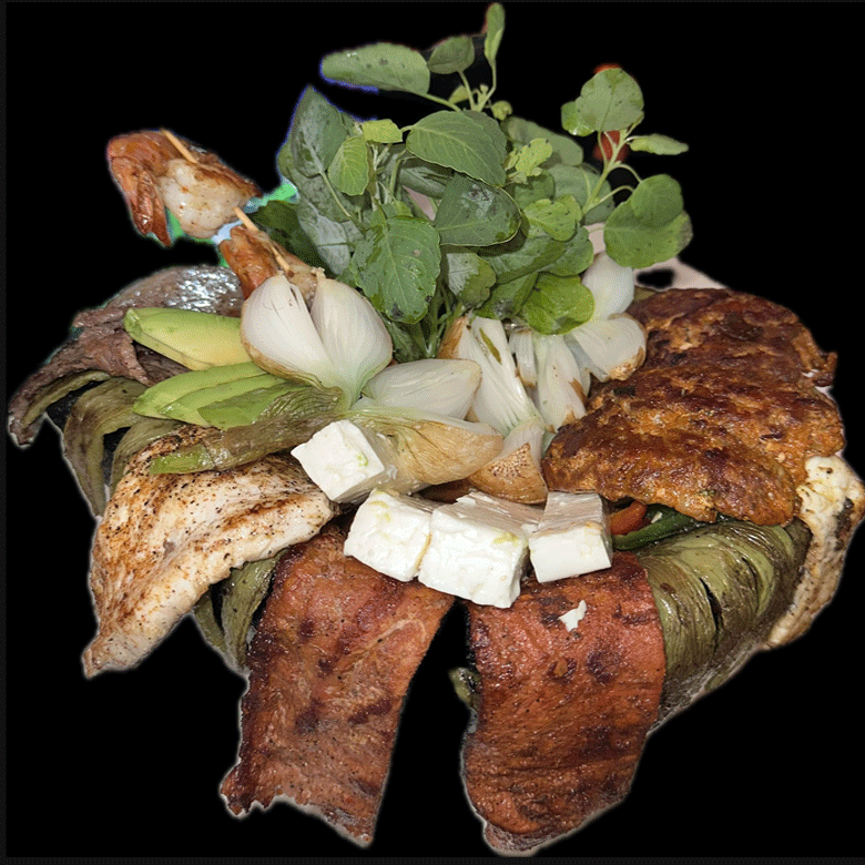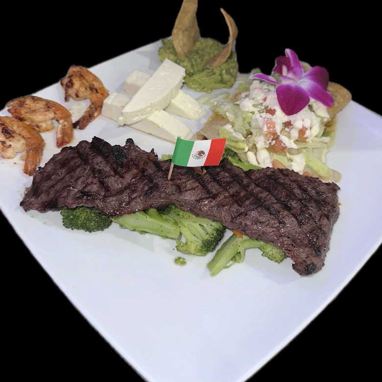 Skirt steak, shrimp, avocado, vegetables, mexican cheese, green enchiladas with chicken.