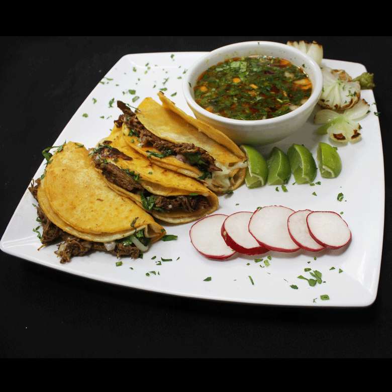 Corn tortilla, lettuce, onion, sour cream, melted cheese, pico de gallo, avocado side Cheese and birria.