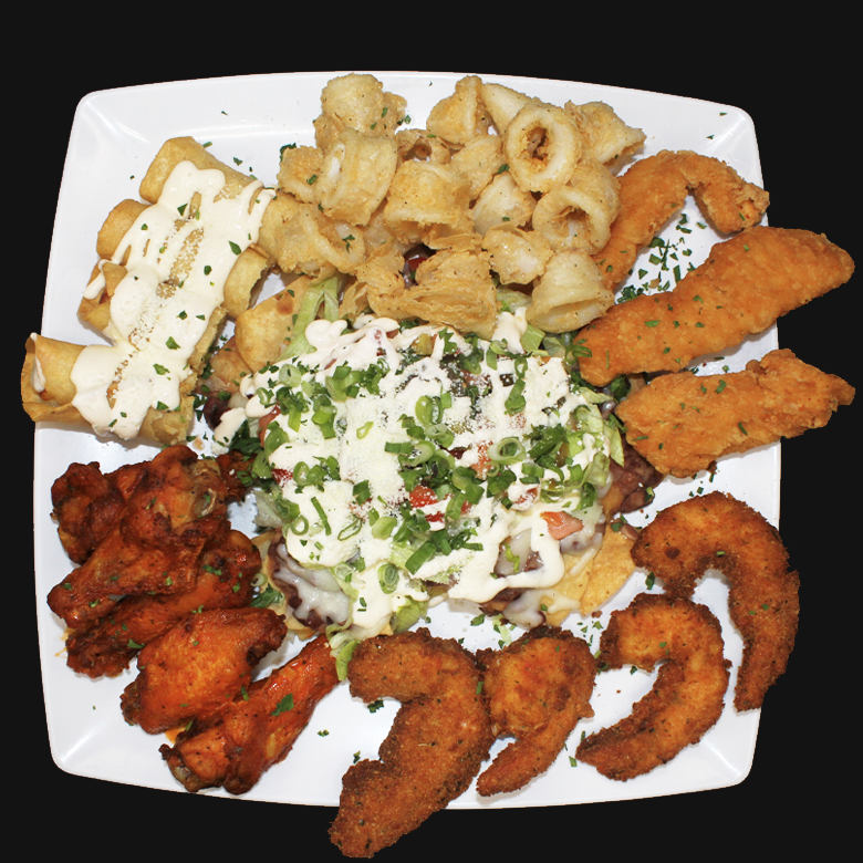 Wings,Chicken tenders,Bredded Shrimp, Bredded Calamari, Nachos & taquitos dorados.