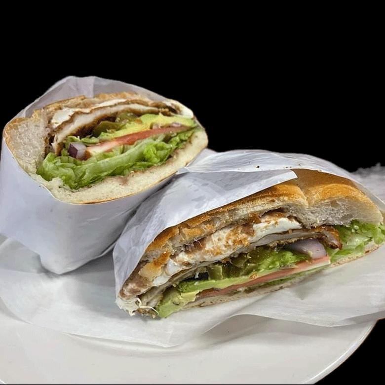 Cemita bread, Beans, avocado, papalo, tomatoe, onion, oaxaca cheese, chipotle pepper, mayonaise, Breaded beef or chicken