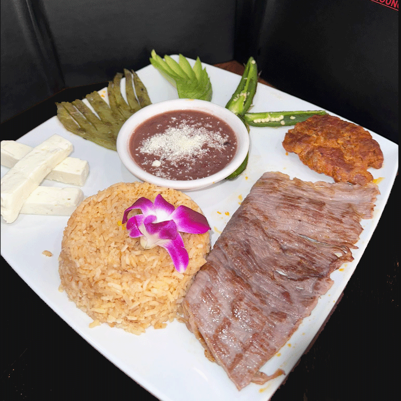 Ribeye steak, sope, queso fresco, avocado, jalapeño, rice & beans.
