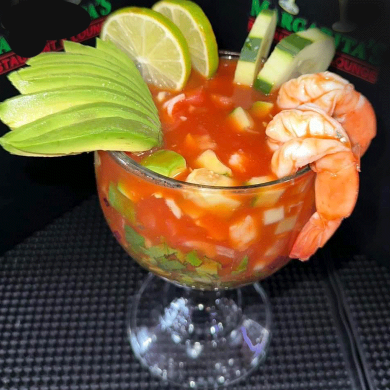 Shrimp, sweet tomatoe juice, avocado, cilantro, onion, tomatoe, lime juice, cucumber, salt and pepper.